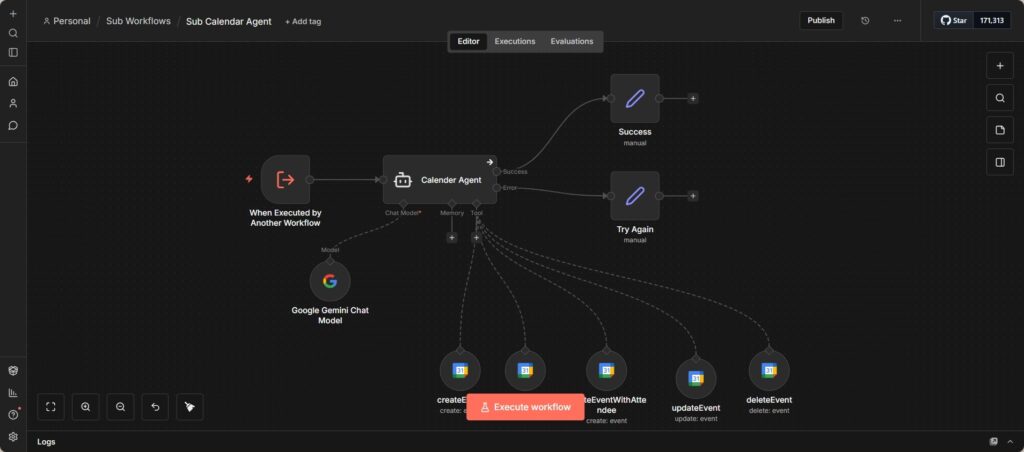 Dieser Workflow implementiert einen spezialisierten Kalender-Sub-Agenten, der von anderen Workflows als Teil einer übergeordneten Orchestrierung aufgerufen wird. Er kapselt sämtliche kalenderbezogene Logik hinter einer klar definierten Ausführungsschnittstelle.
