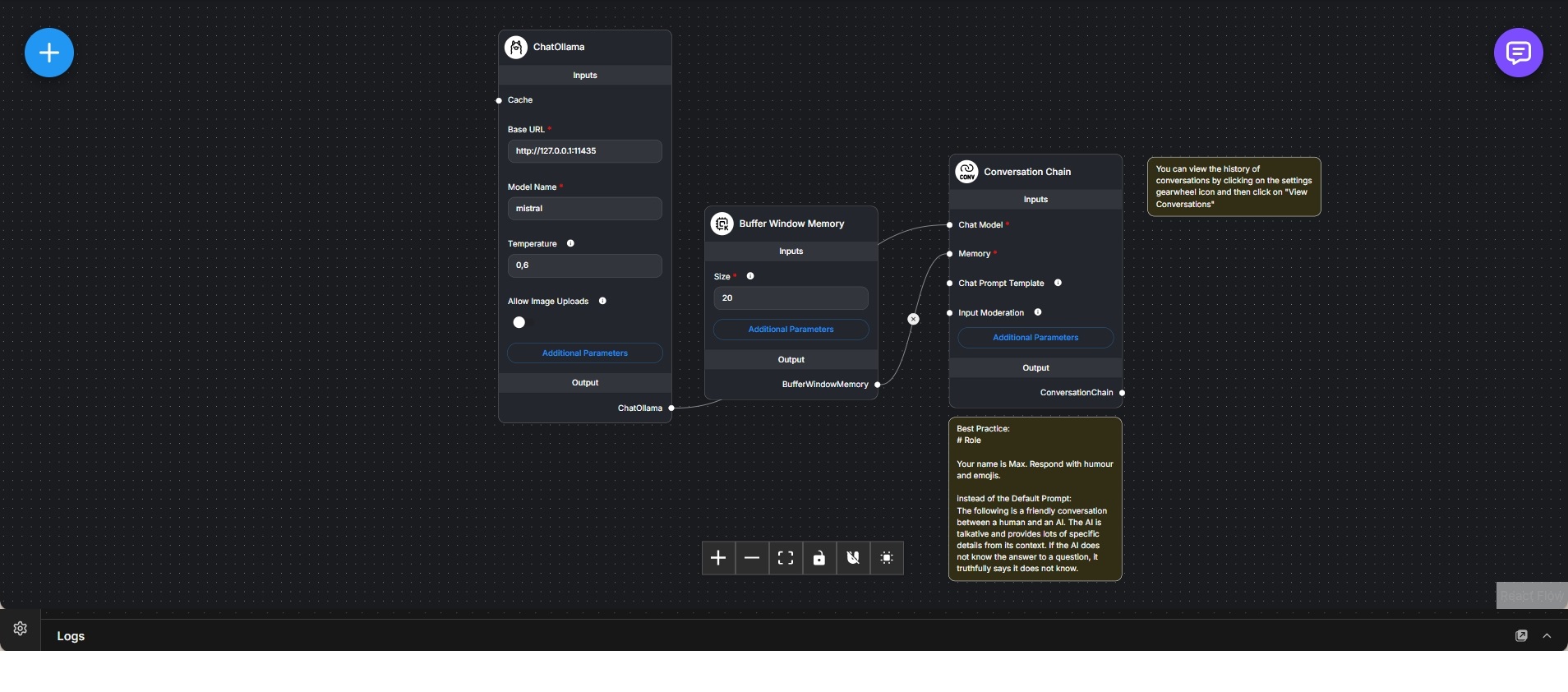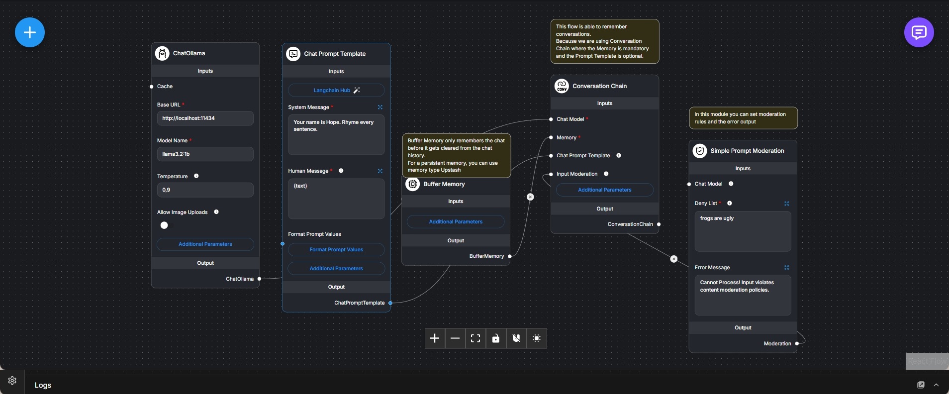Local conversational workflow that combines an Ollama-based chat model, short-term memory, prompt-controlled behavior, and explicit input moderation.