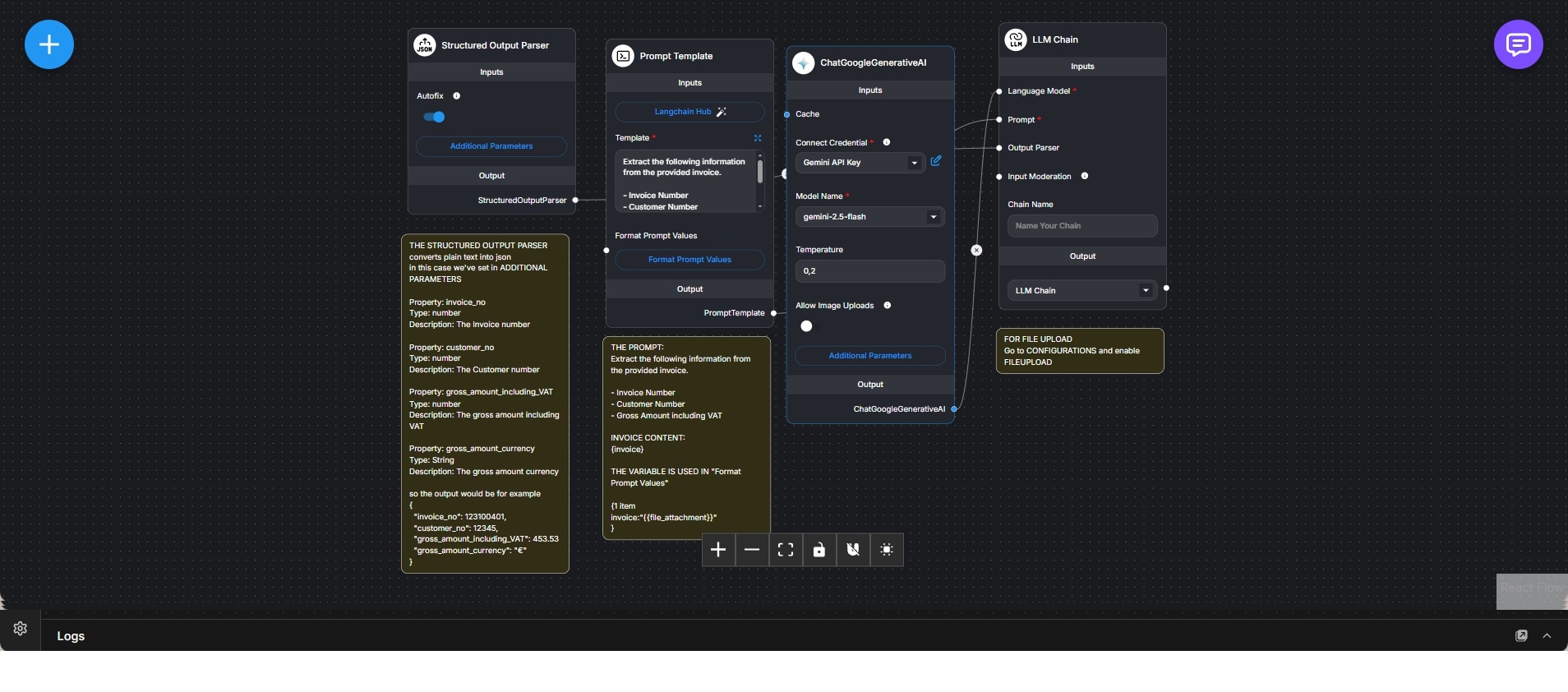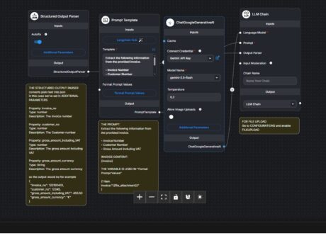 Document analysis workflow that extracts structured invoice data using a language model and a schema-driven output parser.