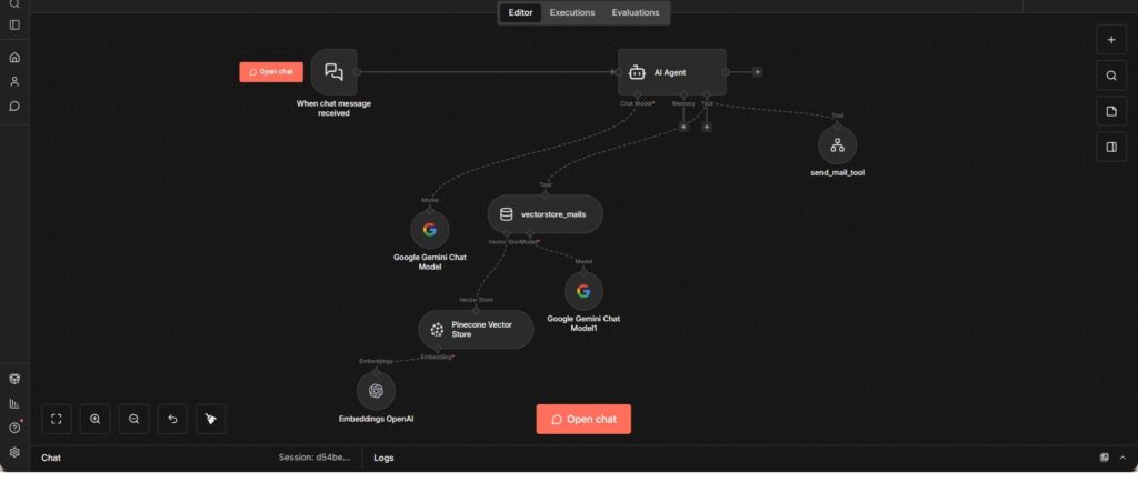Dieser Workflow stellt einen KI-Agenten über eine Chat-Schnittstelle bereit und kombiniert dialogbasierte Eingaben mit vektorbasiertem Retrieval. Eingehende Chat-Nachrichten werden vom Agenten verarbeitet, der bei Bedarf eine Pinecone-Vektordatenbank mit eingebetteten mailbezogenen Inhalten abfragt.