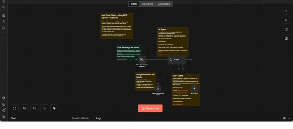 Dieser Workflow implementiert einen chatbasierten Mail-Client, der als Schnittstelle zwischen Benutzeranweisungen und einem externen MCP-Server (Model Context Protocol) fungiert.