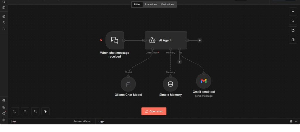 Dieser Workflow stellt einen KI-Agenten über eine Chat-Schnittstelle bereit. Sobald eine neue Chat-Nachricht eingeht, wird diese von einem lokal betriebenen Sprachmodell verarbeitet. Eine einfache Speicherkomponente hält dabei grundlegenden Gesprächskontext vor.
