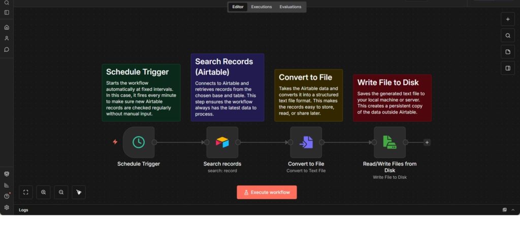 Dieser Workflow bildet eine einfache, zeitgesteuerte Export-Pipeline für Airtable-Daten. Er wird in festen Intervallen automatisch ausgeführt und stellt sicher, dass Datensätze aus einer definierten Airtable-Base und -Tabelle regelmäßig ohne manuelles Eingreifen abgerufen werden.