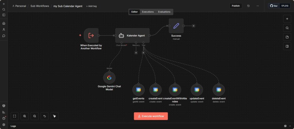 Nach der externen Ausführung erhält der Agent strukturierte Eingaben und entscheidet, welche Kalenderaktion durchgeführt werden soll. Unterstützt werden unter anderem das Abrufen von Terminen, das Erstellen neuer Einträge (mit oder ohne Teilnehmer), das Aktualisieren bestehender Termine sowie das Löschen von Einträgen. Ein Chat-Modell übernimmt dabei die Interpretation der Anfrage und die Zuordnung zur passenden Aktion.