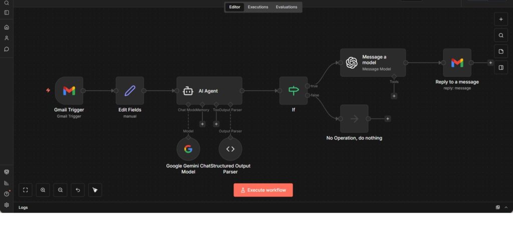 Ein intelligenter E-Mail-Workflow, der eingehende Gmail-Nachrichten mithilfe eines KI-Agenten analysiert, filtert und bei Bedarf automatisch beantwortet.