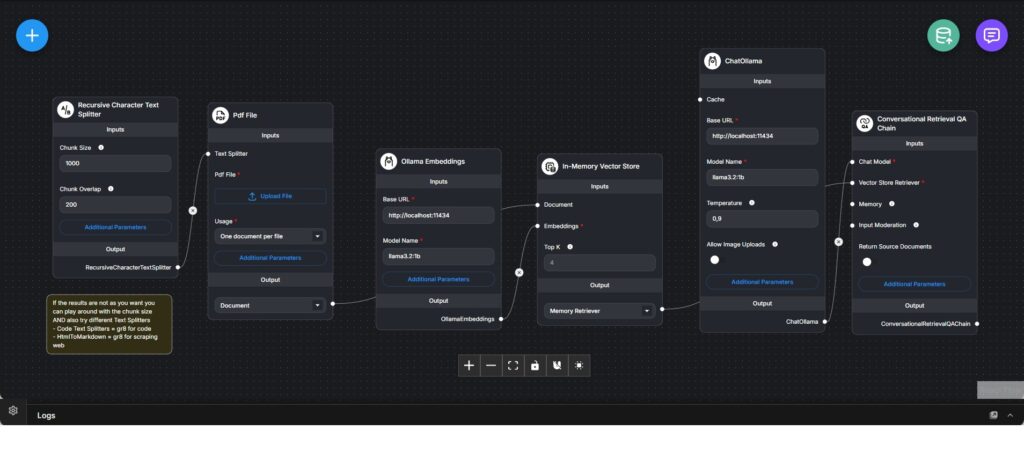 This workflow implements a complete local Retrieval-Augmented Generation (RAG) chatbot designed to answer questions based on the contents of uploaded PDF documents. It demonstrates the full lifecycle of document ingestion, embedding, retrieval, and conversational answering without relying on external cloud services.