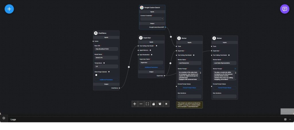 This workflow implements a role-oriented multi-agent system designed for lead research and outreach scenarios. It is structured around a supervisor agent that coordinates multiple specialized worker agents, each responsible for a distinct function within the overall process.
