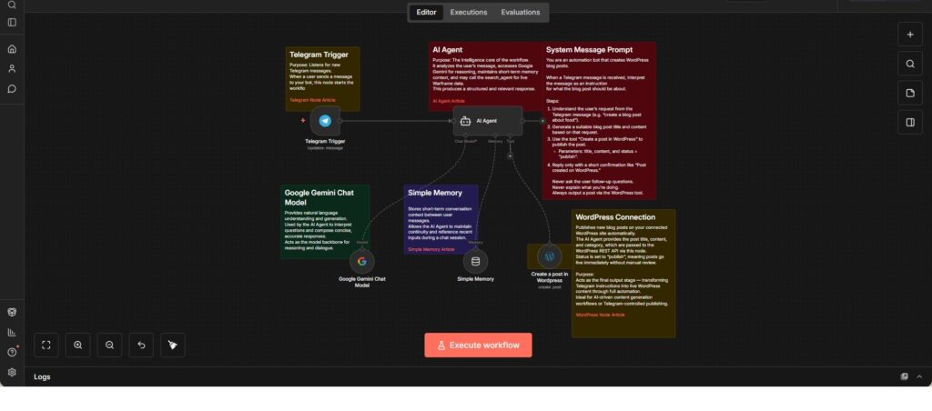 This workflow implements a Telegram-controlled publishing agent designed specifically for creating and publishing WordPress blog posts. Incoming Telegram messages trigger the workflow and are treated as publishing instructions rather than open-ended conversation.