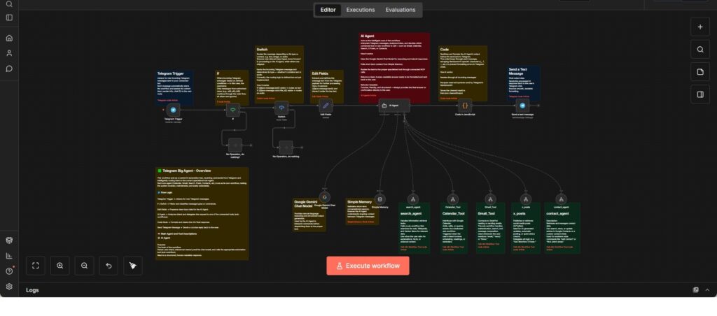This workflow implements a comprehensive Telegram-based orchestration agent that serves as the primary entry point for user interaction. Incoming Telegram messages trigger the workflow and are processed through a structured preprocessing layer before being passed to the core agent.